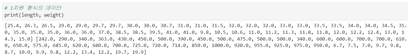 - 종속변수(생선 이름) → 종속변수는 1차원 데이터 형태