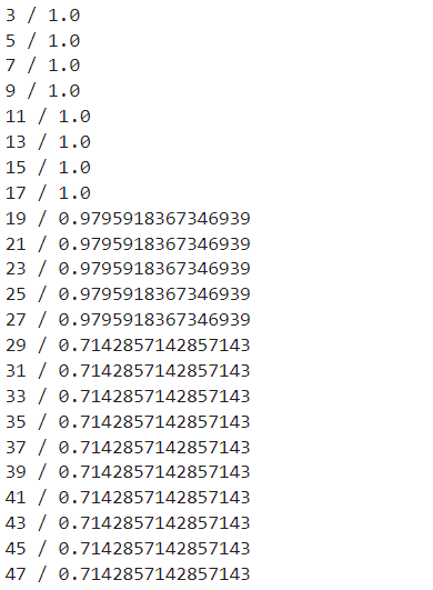 - 방법2 : 반복문 사용하여 1보다 작은 가장 좋은 정확도일 때의 이웃의 갯수 찾기