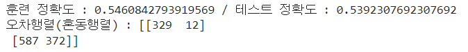 print(f"훈련 정확도 : {train_acc} / 테스트 정확도 : {test_acc}")