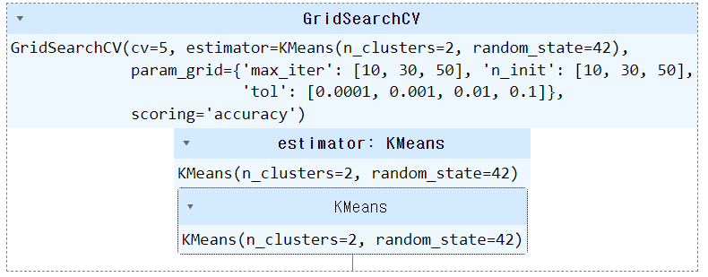 grid_search = GridSearchCV(kmeans, param_grid, cv=5, scoring="accuracy")