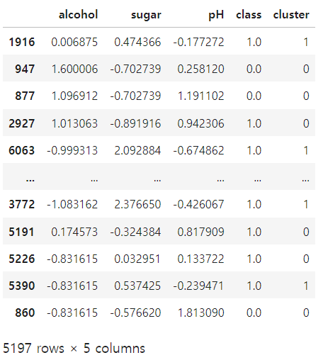 - 군집분류에서는 별도로 훈련과 검증데이터로 분류하기 않고, 전체 데이터를 사용하여 군집합니다.