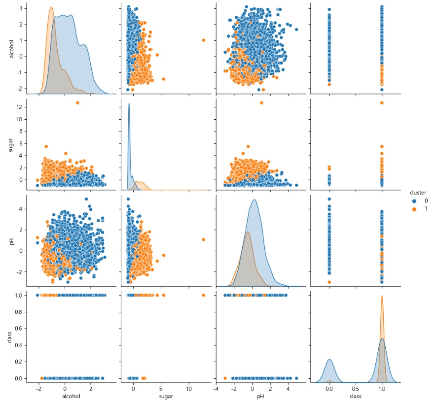 섞여있으면 군집이 안된 것 (예를 들어, alcohol과 pH)