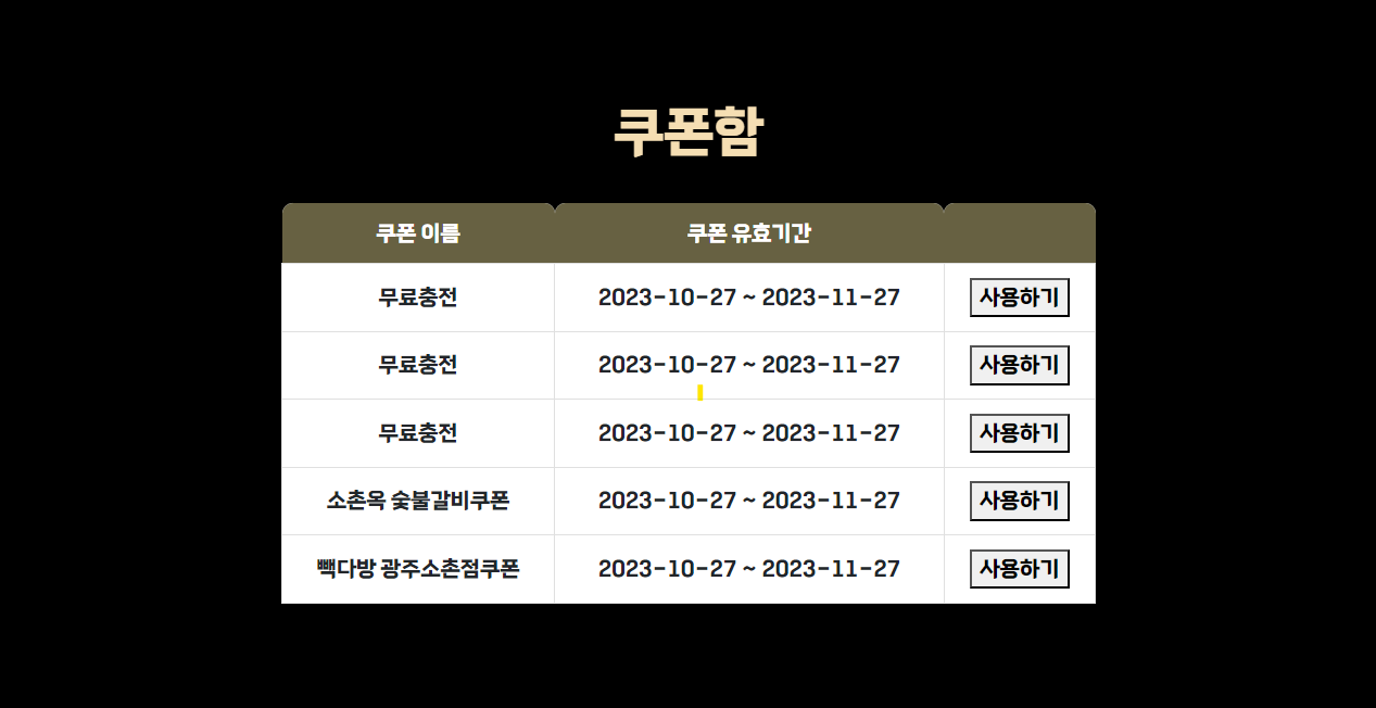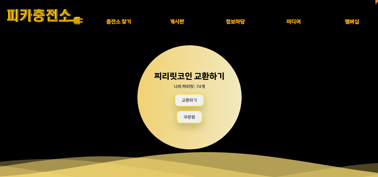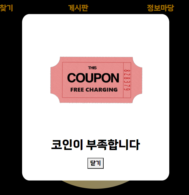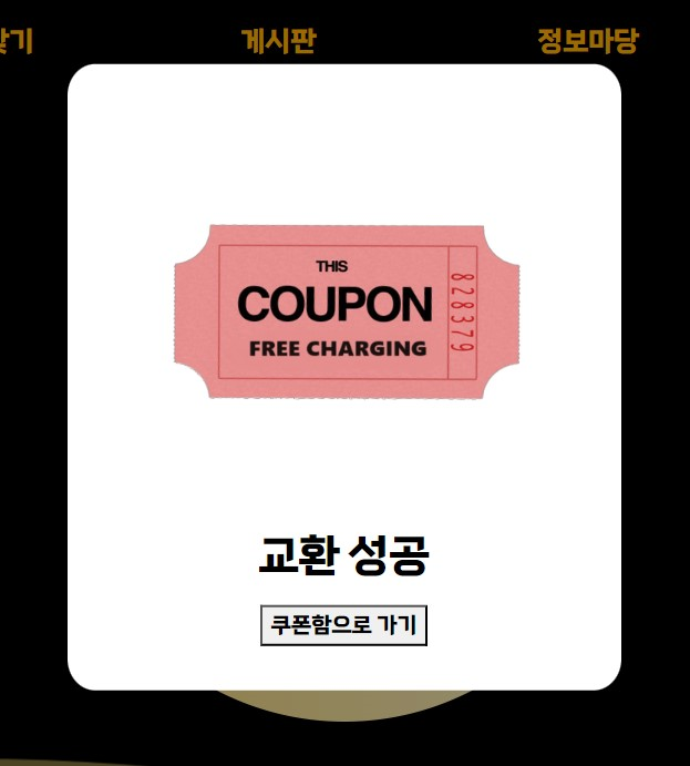 게임에서 얻은 코인을 쿠폰으로 교환할 수 있는 페이지이다. 코인 10개당 1개의 무료 충전 쿠폰으로 교환 되며 교환 성공 시 교환 성공 모달이 코인이 없어 교환이 실패 되면 코인이 부족하다는 모달 창이 뜨게 된다.