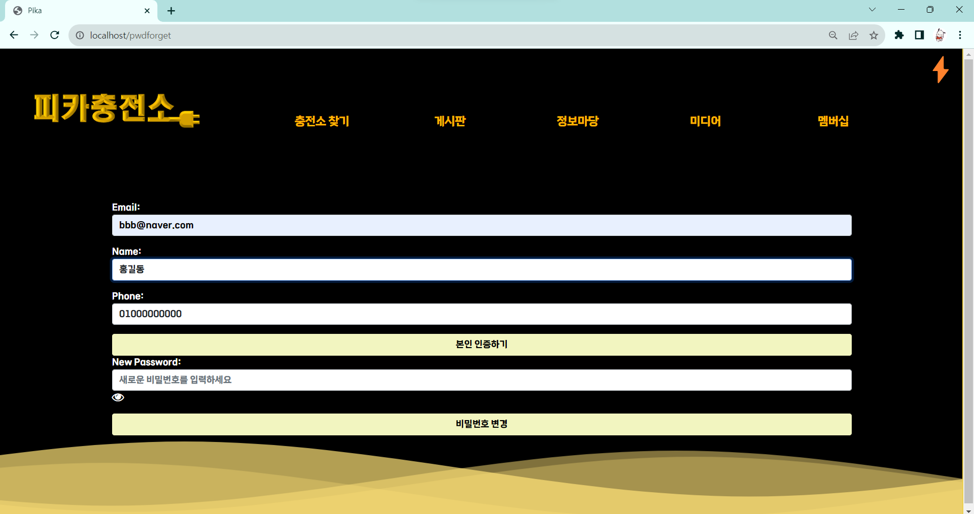 로그인 창 아래의 '비밀번호가 기억나지 않는다면?'을 클릭하면 본인 인증 후 비밀번호를 새롭게 설정할 수 있. 본인인증에 실패하면 '입력하신 정보와 일치하는 사용자를 찾을 수 없습니다.' 라는 알림창이 뜨기 때문에 DB에 있는 계정만이 본인인증에 성공해서 비밀번호를 변경할 수 있다.