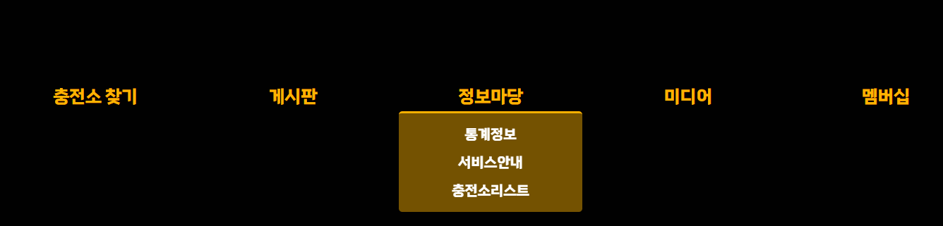 5개의 카테고리로 구성되어 있고, 하위 항목이 있는 카테고리일 경우 해당 카테고리에 마우스를 올리면 하위 항목들이 아래로 내려온다.