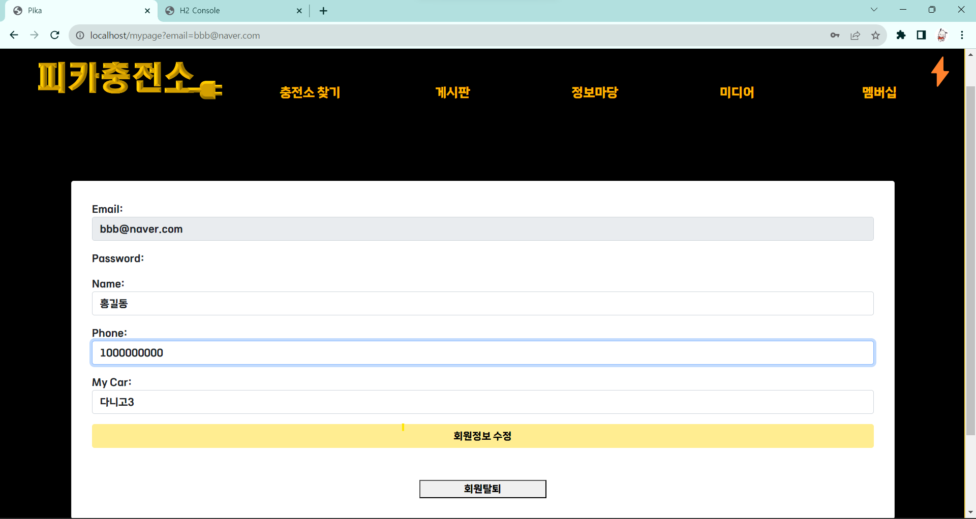 게시판은 공지사항, Q&A로 나뉘어져있으며 글쓰기와, 글의 수정 삭제가 가능하다. Q&A는 일반 글쓰기와, 충전소 추가요청, Car정보 추가요청이 따로 나뉘어져 있어서 각각 추가요청을 하고 글을 쓰면 추가 요청 리스트가 보이게 된다.