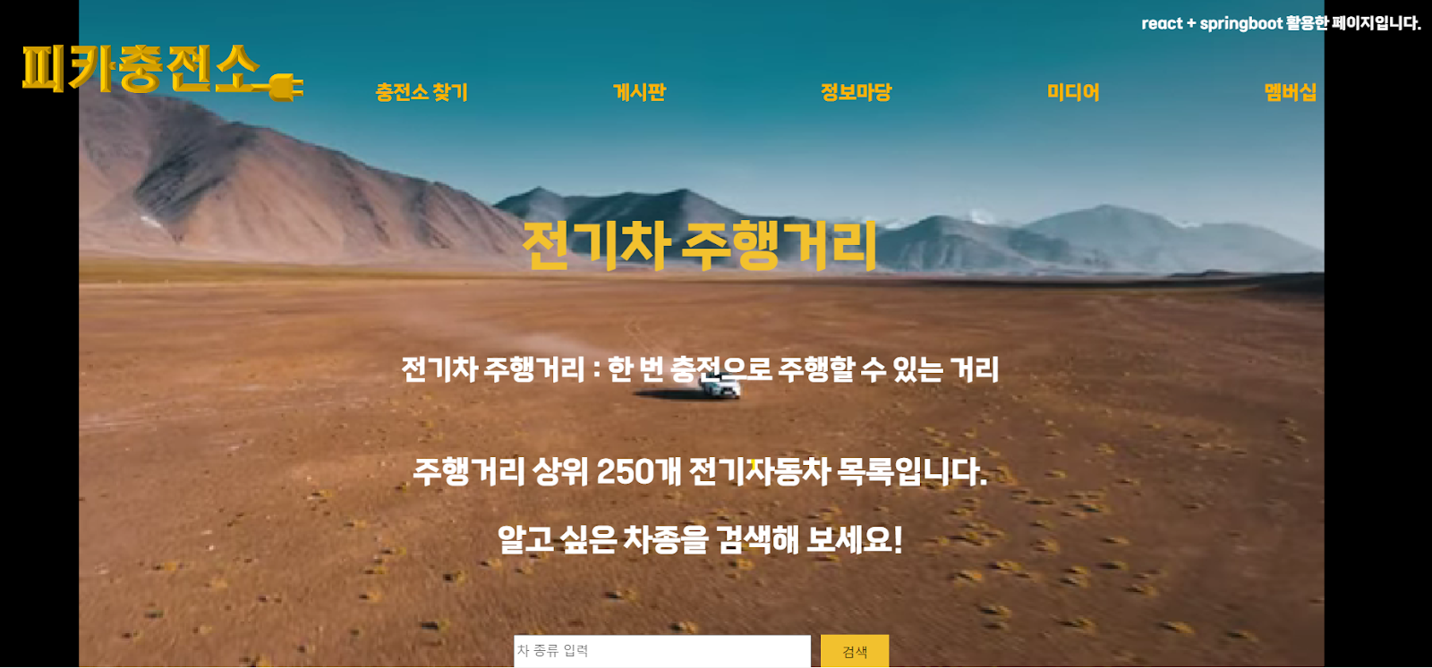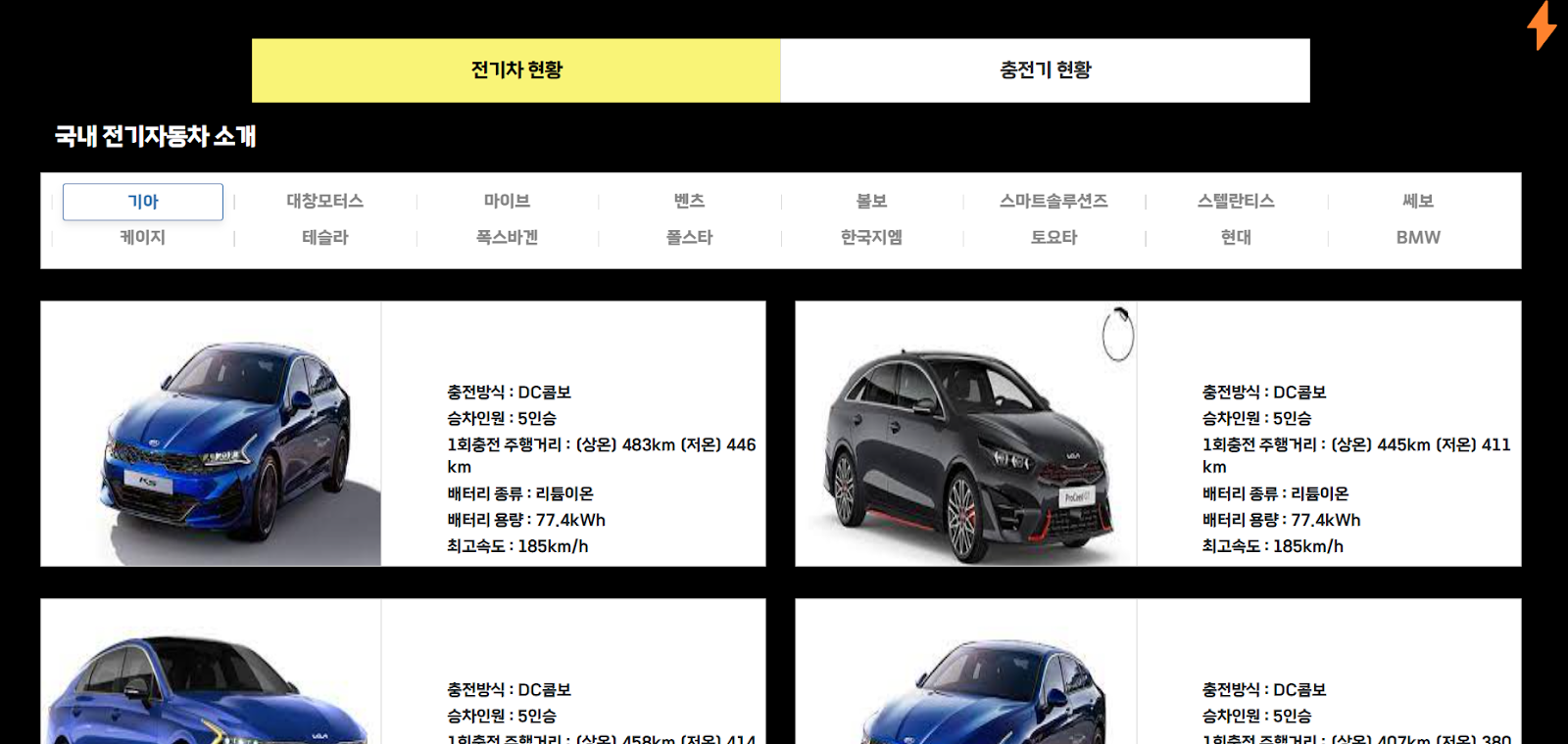 유일하게 리액트로 구현한 페이지로 해당 페이지에 들어가면 전기차에 따른 주행거리를 알 수 있으며, 자신이 궁금한 차량을 검색해서 볼 수도 있다.