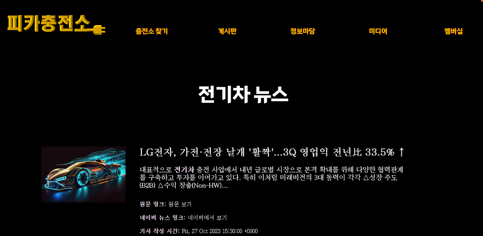 뉴스 API를 이용해 전기차 관련 뉴스를 불러와 보여주고 있으며 네이버 뉴스 링크로 이동이 가능하다.
