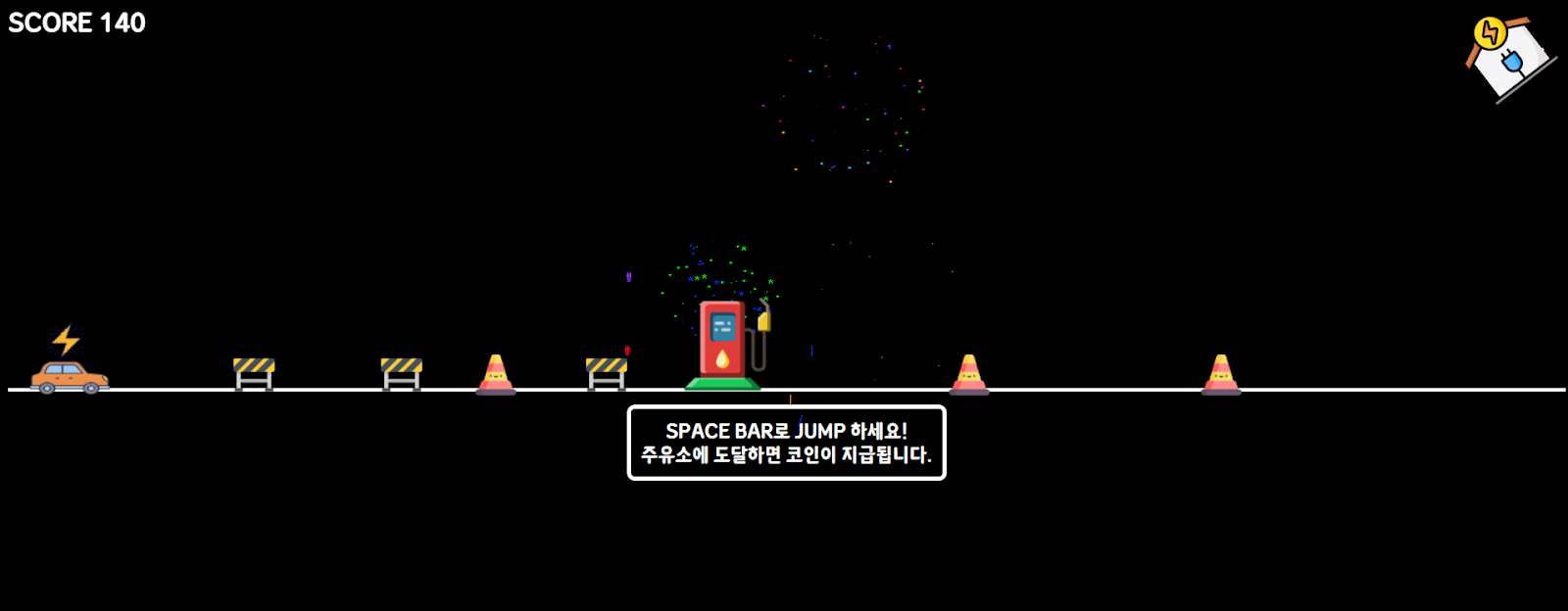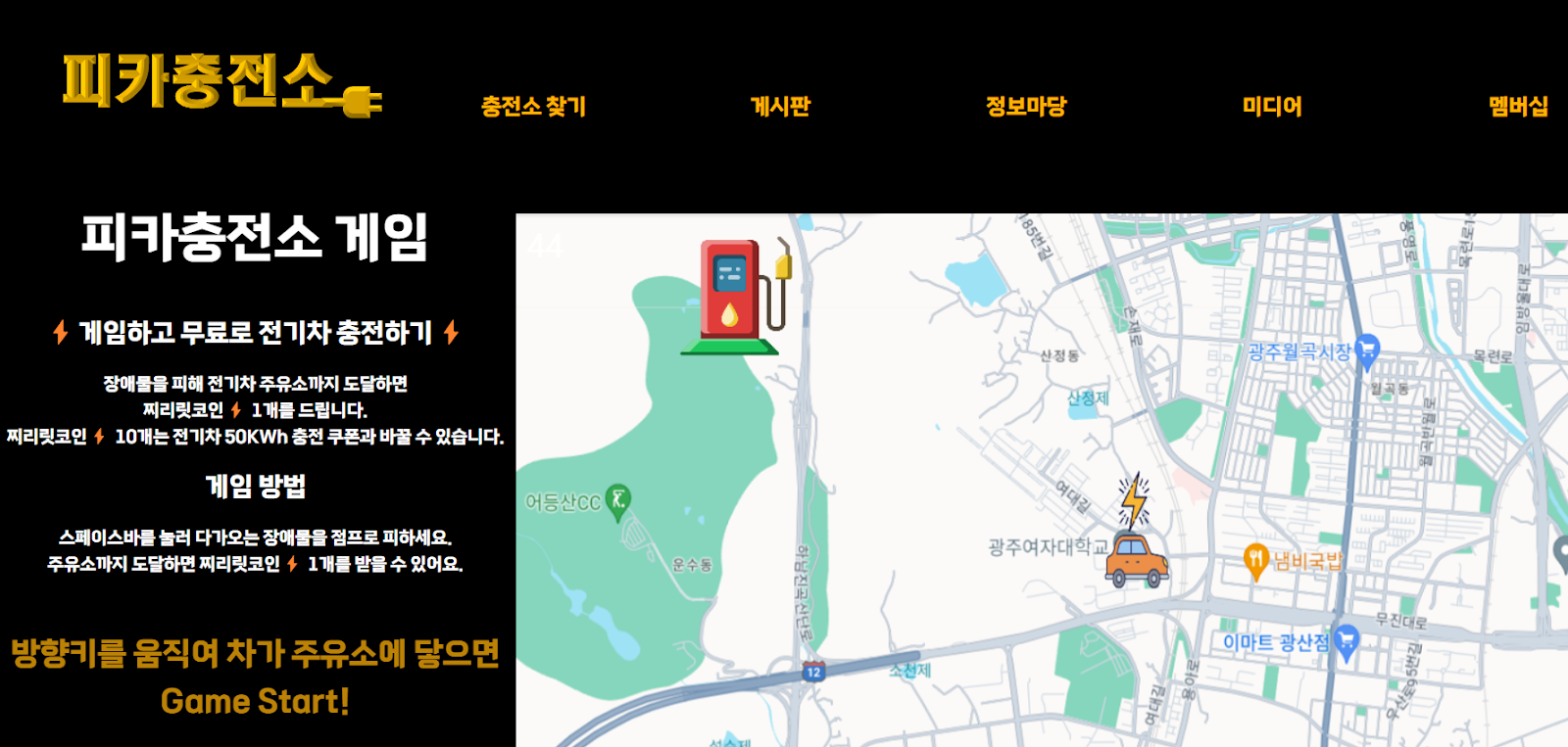 전기차 게임 페이지 들어가면 왼쪽에 게임 관련 설명이 나와있고 오른쪽 미니 게임에서 키보드로 자동차를 움직여 충전소로 가면 본 게임이 시작된다. 만약 자동차가 지도의 가장자리에 닿으면 다음 지도로 전환되게 구현하였다.