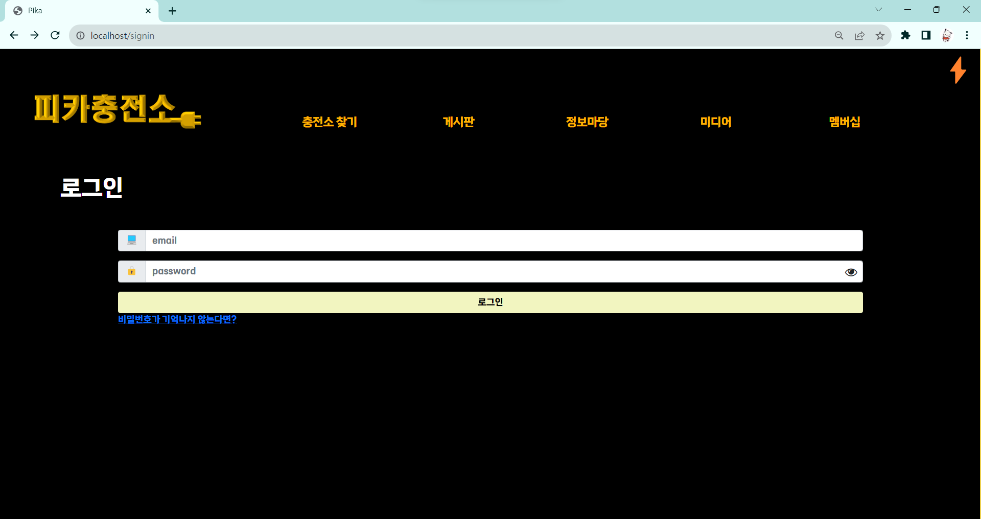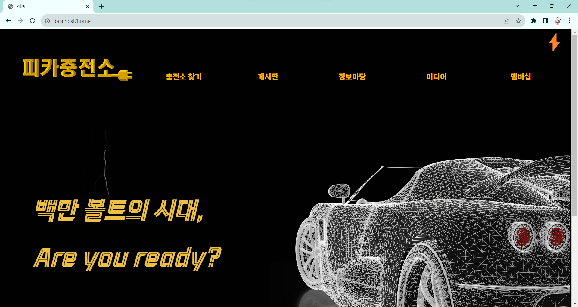 상단에 웹 이름, 로고, 카테고리를 두었고 오른쪽에 사이드바(현재 닫힘), 중간에 피카충전소의 슬로건과 관련 이미지를 배치하였다. 뒷 배경에 번개가 치는 애니메이션 효과를 넣어 전기라는 이미지가 떠올리게 하였다.