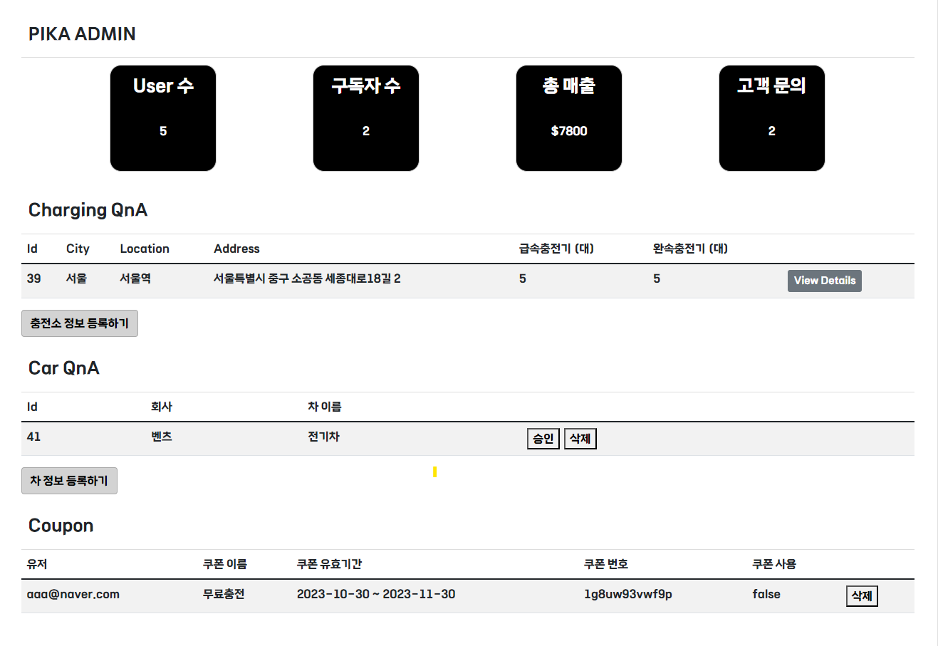 회원가입 시 관리자는 관리자 계정으로 회원가입을 할 수 있다. 관리자로 로그인하게 되면 사이드바에 Admin이라는 항목이 나타나게 되는데 해당 페이지에서 user 수, 구독자 수, 고객문의 수 등을 알 수 있다. 또한 user들의 Charging Q&A, Car Q&A, 발급 된 Coupon 을 한 페이지에서 볼 수 있어 관리하기 쉽게 구현해 놓았다.