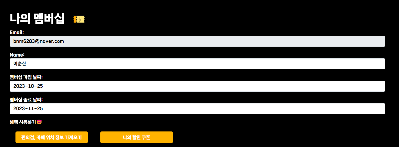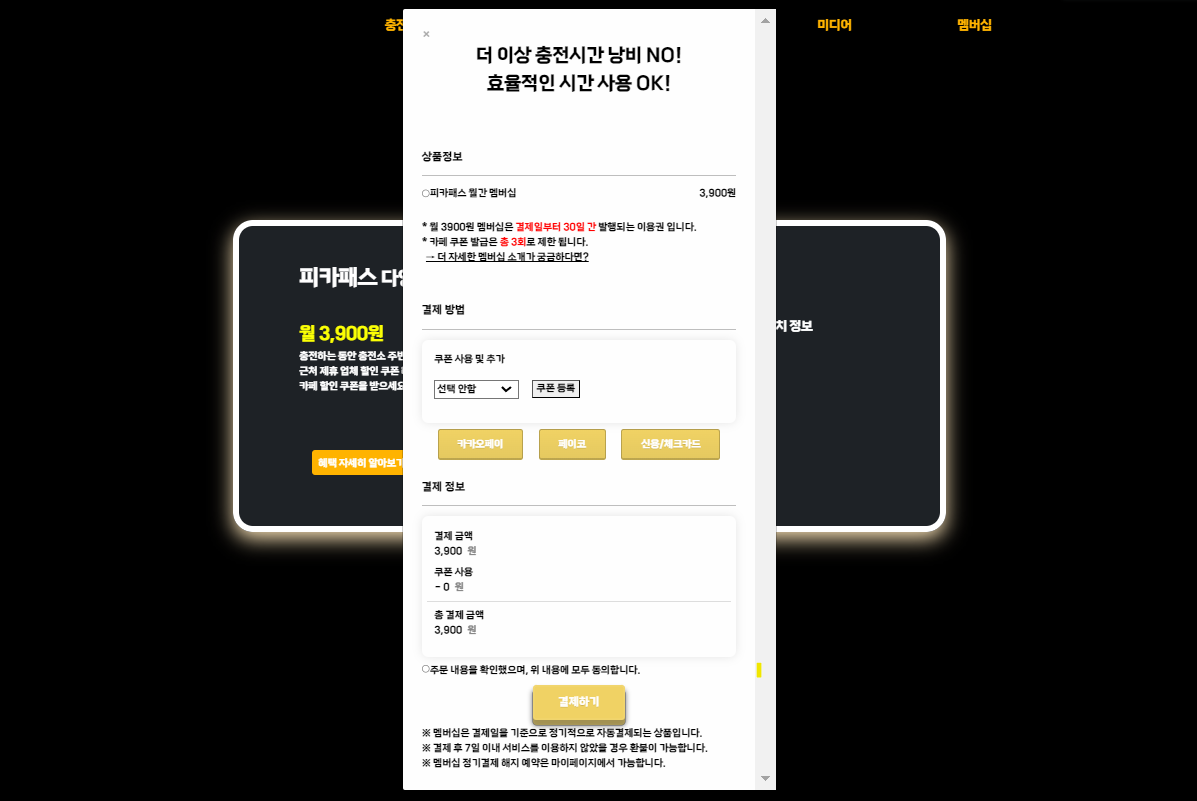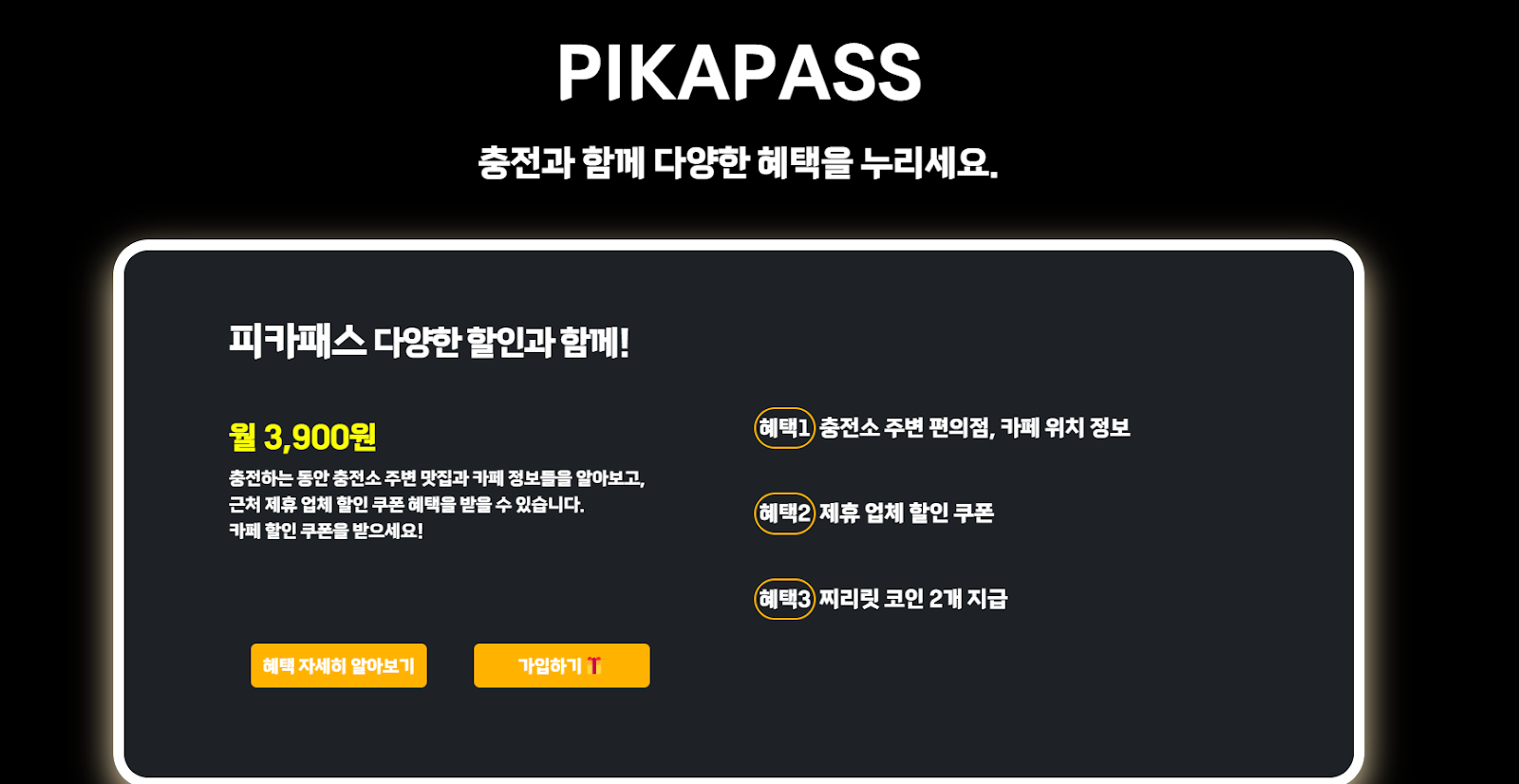 피카 PASS라는 멤버십에 가입 할 수 있도록 멤버십 혜택 보기와 가입하기를 구현해 놓았다. 멤버십에 가입을 한다면 로그인 했을 시 멤버십 카테고리에 마이멤버십이라는 항목이 생기는데 이곳에선 멤버십 종료 날짜를 알 수 있다. 또한 멤버십 가입 혜택인 충전소 근처 편의점, 카페, 음식점의 위치 정보와 해당 매장의 쿠폰을 발급 받을 수 있도록 하였다.