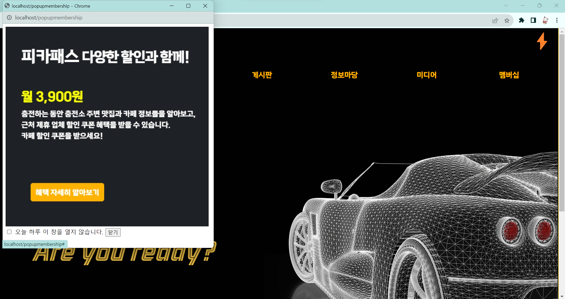 첫 화면에 들어오면 멤버십 가입 관련 팝업이 뜬다. '혜택 자세히 알아보기'를 누르면 멤버십 가입 페이지로 이동하고 '오늘 하루 이 창을 열지 않습니다'에 체크한 뒤 닫기를 누르면 쿠키에 정보가 저장이 되어 오늘 하루 팝업 창이 뜨지 않는다.