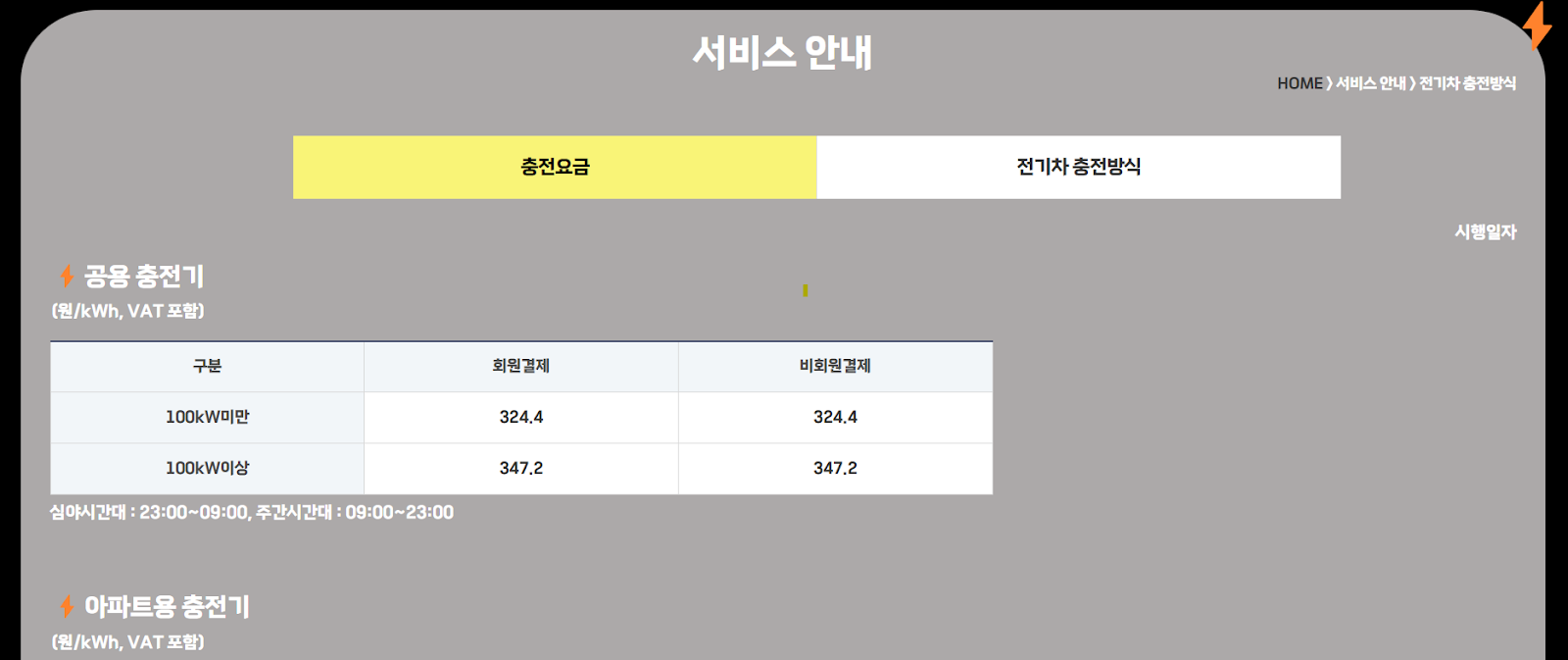 정보마당에는 통계정보와 서비스 안내가 있다. 통계정보에는 전기차 현황과 충전기 현황을 볼 수 있도록 나누어 놓았으며, 서비스 안내에는 충전요금, 전기차 충전방식을 볼 수 있도록 나누어 놓았다.