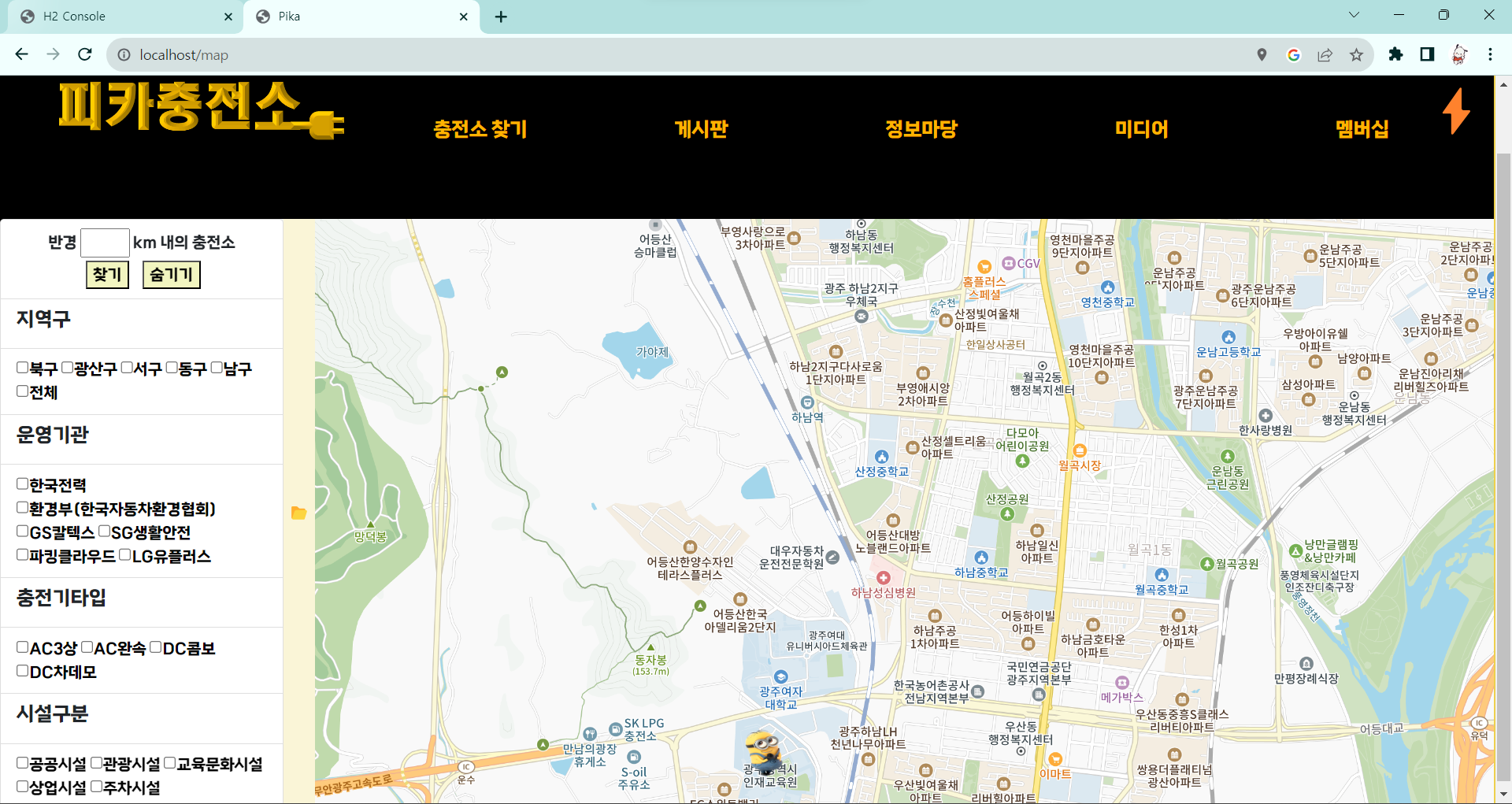 충전소 찾기로 들어오면 왼쪽 사이드바를 이용하여 지정한 반경 이내의 전기차 충전소 위치를 확인 할 수 있고, 카테고리별로 항목을 선택하여 전기차 위치를 볼 수 있다.
