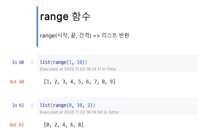 - range() : range(시작, 끝, 간격)을 리스트로 반환해준다.