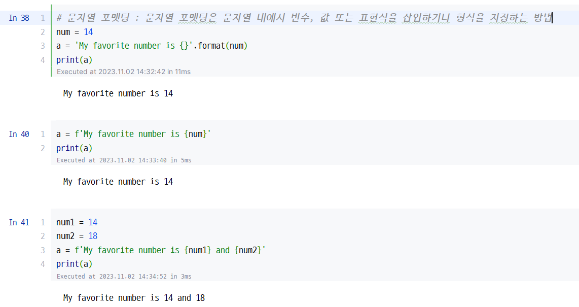 - 문자열 포맷팅 : 문자열 내에서 변수, 값 또는 표현식을 삽입하거나 형식을 지정하는 방법