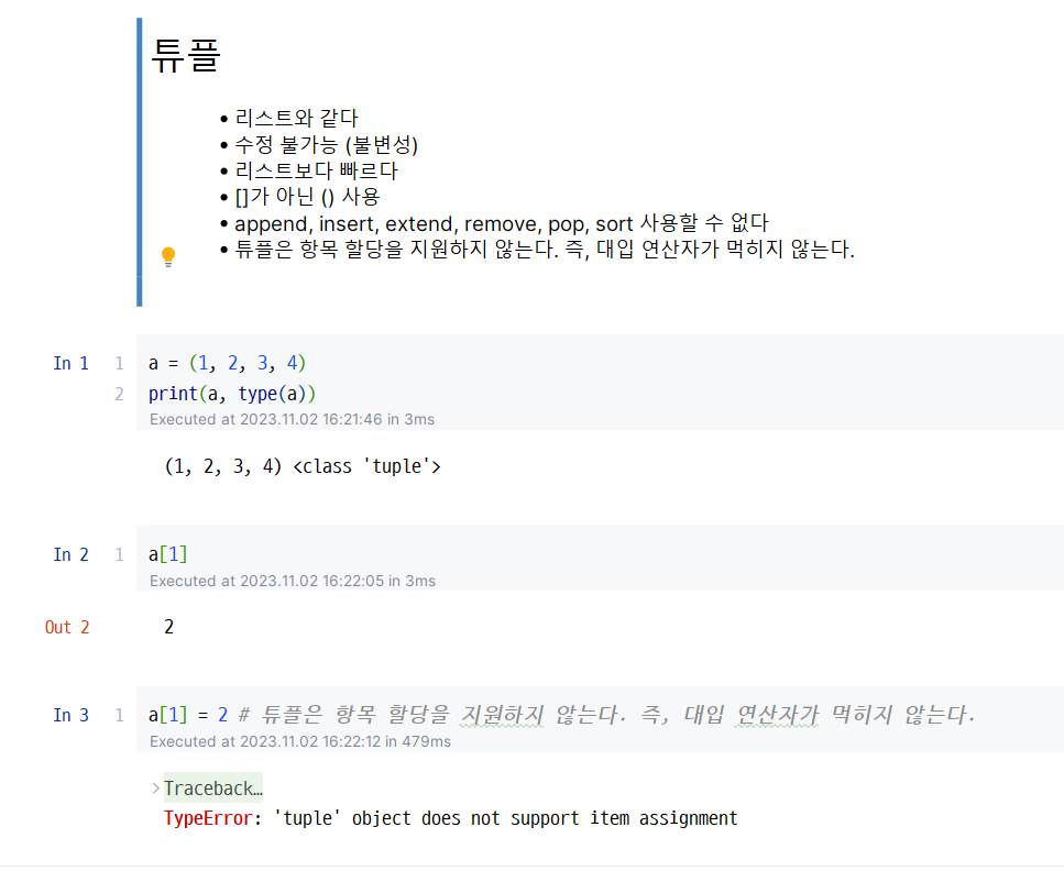 - 튜플은 항목 할당을 지원하지 않는다. 즉, 대입 연산자가 먹히지 않는다.