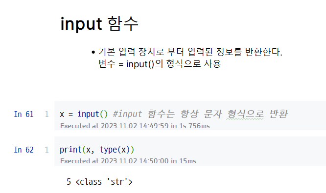 - input() : 기본 입력 장치로 부터 입력된 정보를 반환한다.변수 = input()의 형식으로 사용