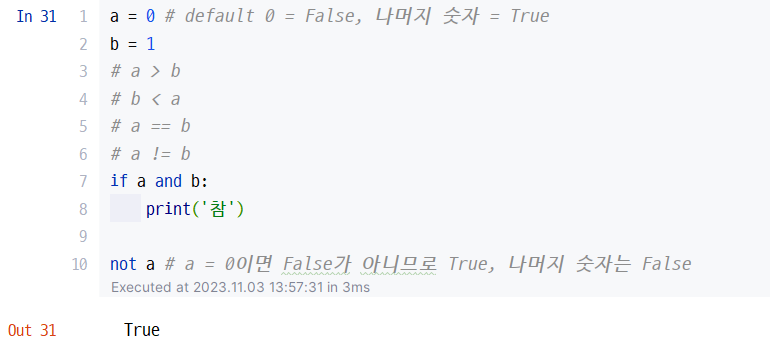 - 숫자에서 0 은 False이며 나머지 숫자는 True의 값을 갖는다.