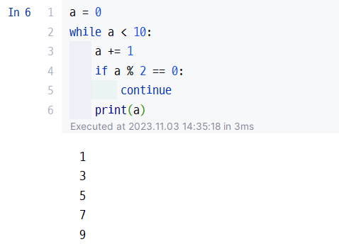 - countinue : 조건에 해당하는 경우 그 값을 출력하지 않고 건너뛴다.