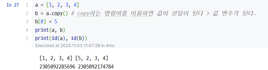 - copy() : 값을 받아오는 변수가 참조 변수일 경우에도 copy()로 값을 받아오면 값 변수가 된다.