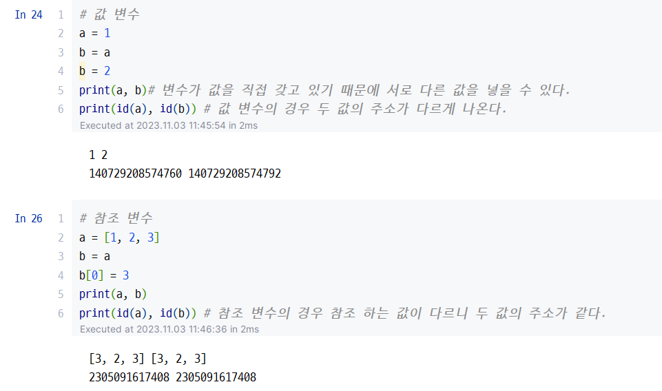 - 파이썬의 예약어(파이썬이 사용하는 특수한 언어)를 변수로 사용할 수 없다.