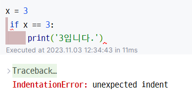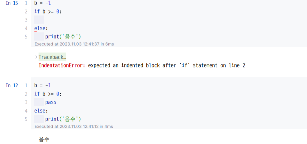 - pass : 조건문은 있지만 실행할 문장이 없을 경우, 오류를 무시하기 위해서 if 문에 작성하여 조건문을 넘기는 기능