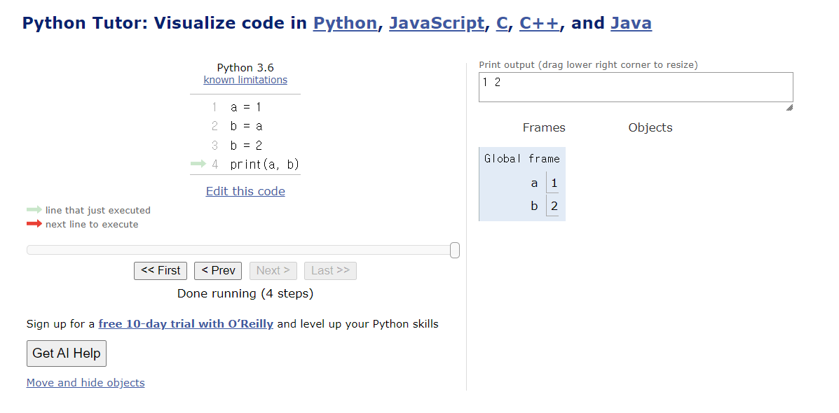 Online Python Tutor - visualize, debug, get AI help for Python, Java, C, C++, and JavaScript
