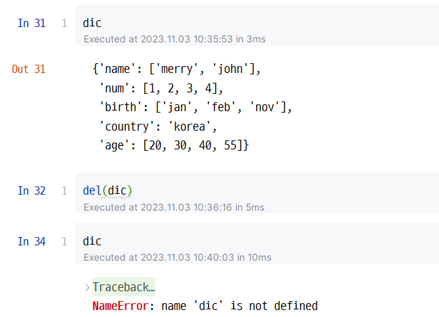 - del() : 메모리 상의 변수를 지우는 함수 (다른 변수에도 사용 가능)