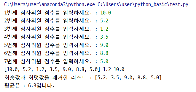 7명의 심판들의 점수를 입력받아 리스트에 저장하고 최소값과 최대값을 리스트에서 제거하는 프로그램을 작성해보자