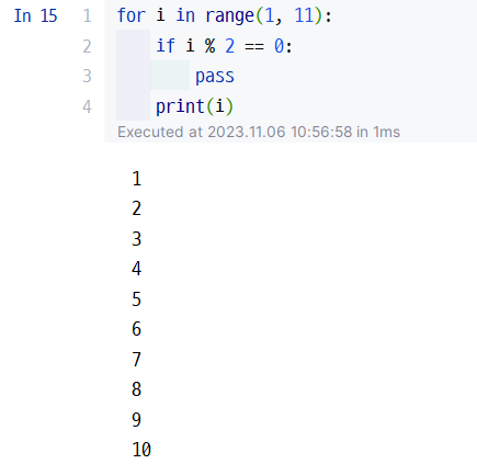 > pass : 실행할 코드가 없는 것을 뜻함.(모두 다 실행하고 그 다음 루프로 넘어간다.)