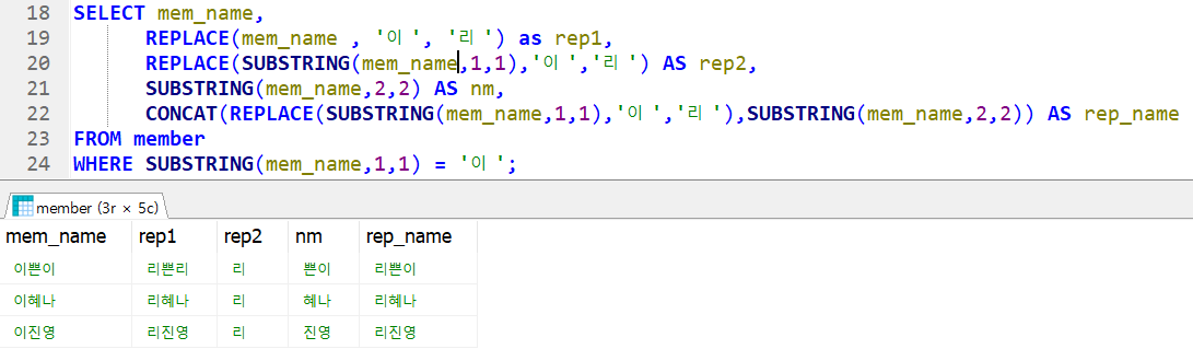 REPLACE(mem_name , '이', '리') as rep1,