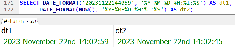 SELECT DATE_FORMAT('20231122144059', '%Y-%M-%D %H:%I:%S') AS dt1,