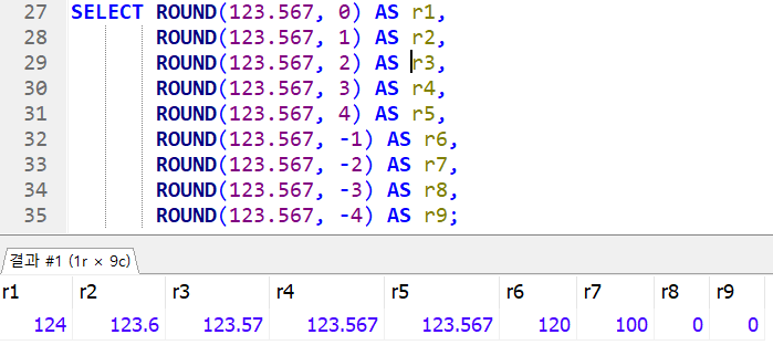 SELECT ROUND(123.567, 0) AS r1,