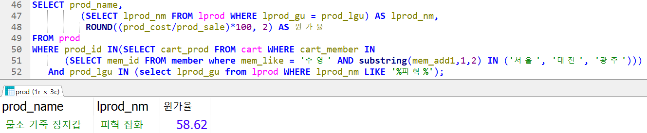 SELECT prod_name, ROUND((prod_cost/prod_sale)*100, 2) AS 원가율