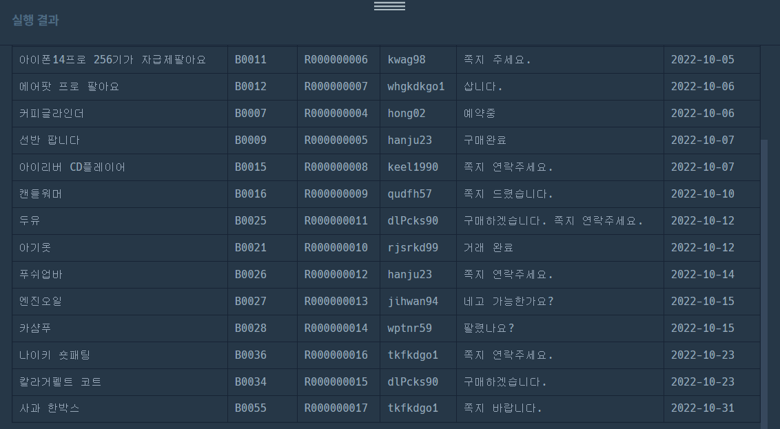 | R000000001 | B0001 | s2s2123 | 구매하겠습니다. 쪽지 드립니다. | 2022-10-02 |