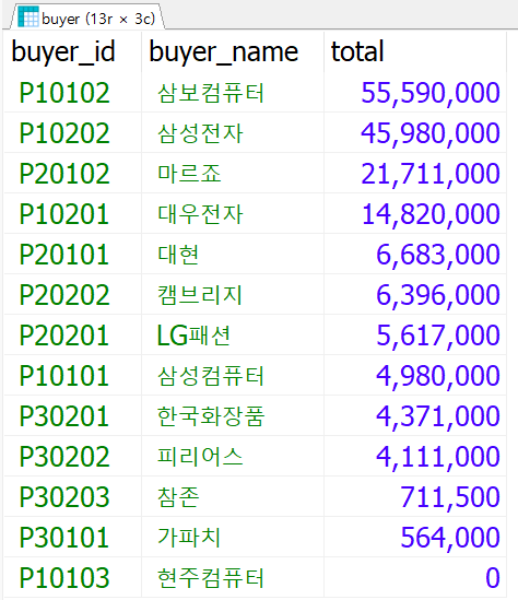 - 정렬 : 총매출금액 - 내림차순