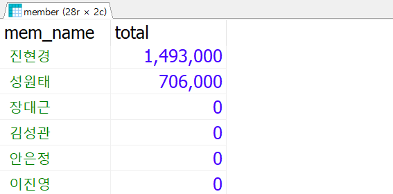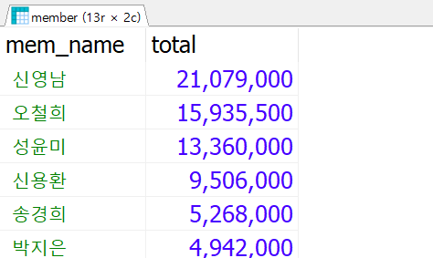 - 조회칼럼 : 회원이름, 구매금액 총액