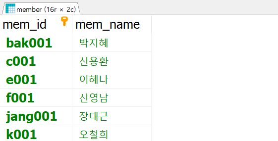 - 조회칼럼 : 회원아이디, 이름