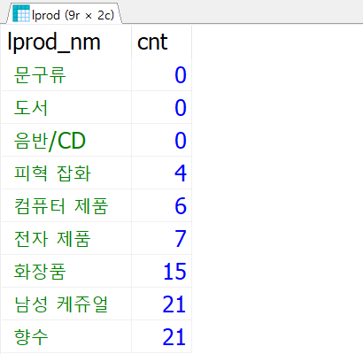 SELECT lprod_nm, COUNT(prod_lgu) AS cnt