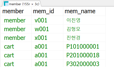 SELECT 'cart', cart_member, cart_prod