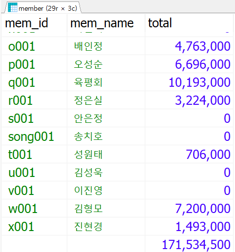 SELECT mem_id, mem_name, mem_mileage, SUM(nvl(cart_qty*prod_sale,0)) AS total