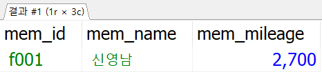 - 조회컬럼 : 회원아이디, 회원이름, 마일리지