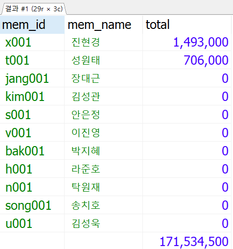 SELECT mem_id, mem_name, SUM(nvl(cart_qty*prod_sale,0)) AS total
