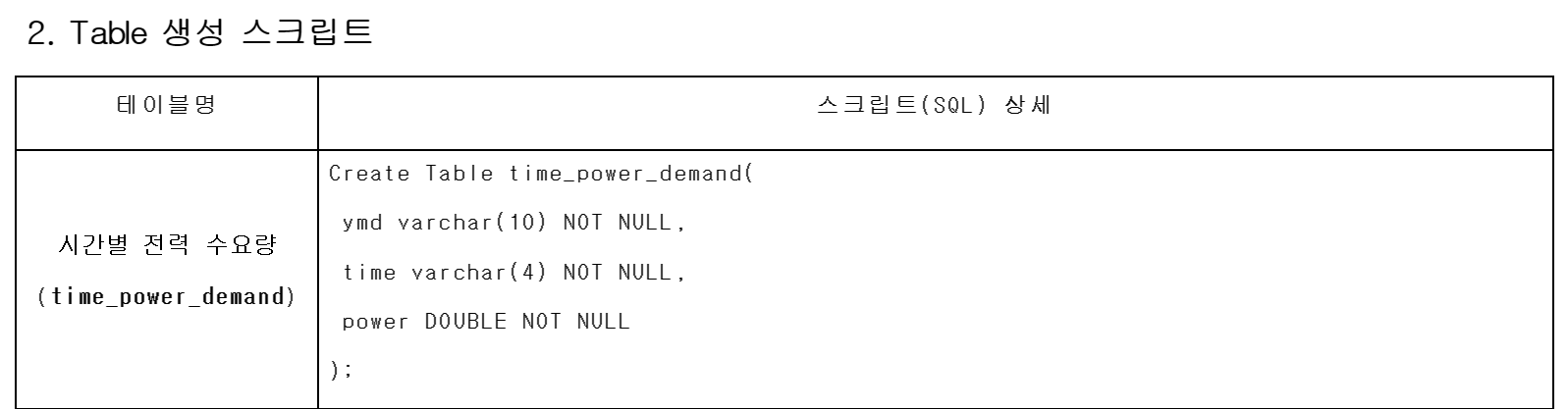 - 테이블명, 컬럼명, 컬럼타입, null 여부에 대한 정의가 필요함