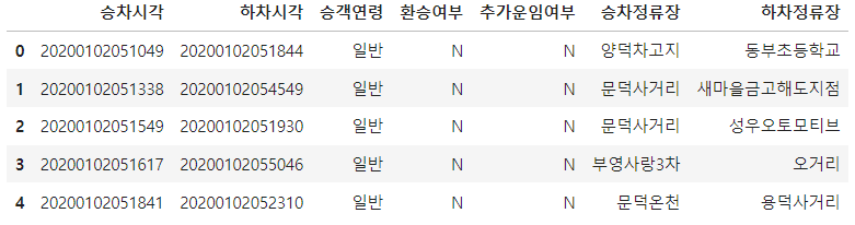 df_bus_card = df_bus_card_kor[["승차시각", "하차시각", "승객연령", "환승여부",