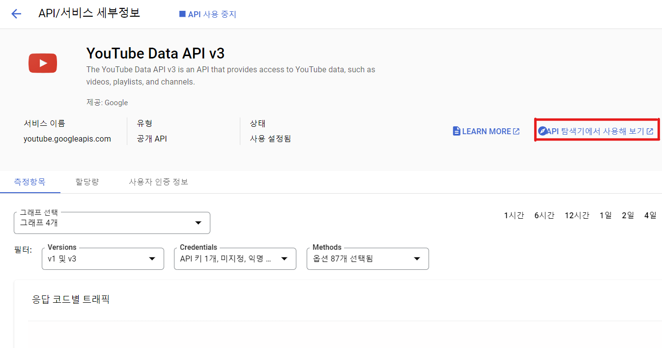 사용 설정된 API 및 서비스 > YouTube Data API v3 > API 탐색기에서 사용해 보기