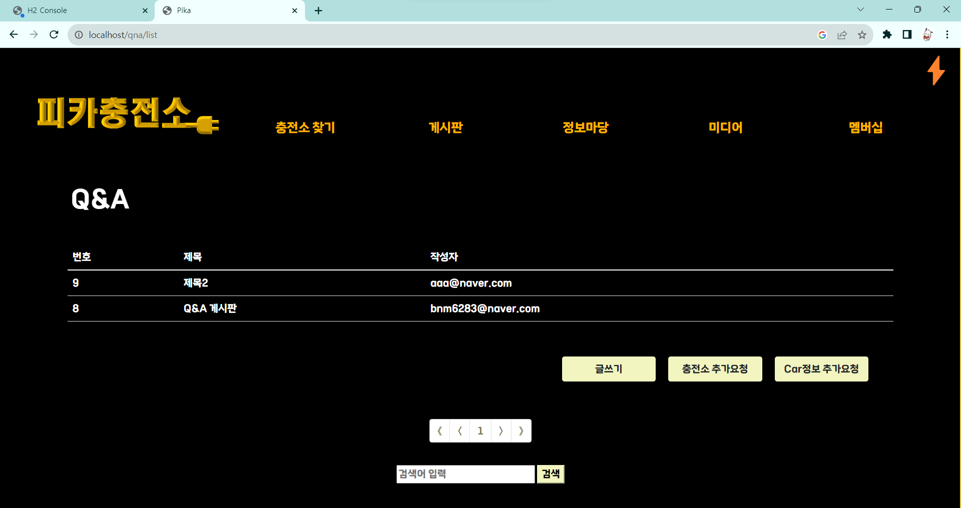 게시판은 공지사항, Q&A로 나뉘어져있으며 글쓰기와, 글의 수정 삭제가 가능하다. Q&A는 일반 글쓰기와, 충전소 추가요청, Car정보 추가요청이 따로 나뉘어져 있어서 각각 추가요청을 하고 글을 쓰면 추가 요청 리스트가 보이게 된다.