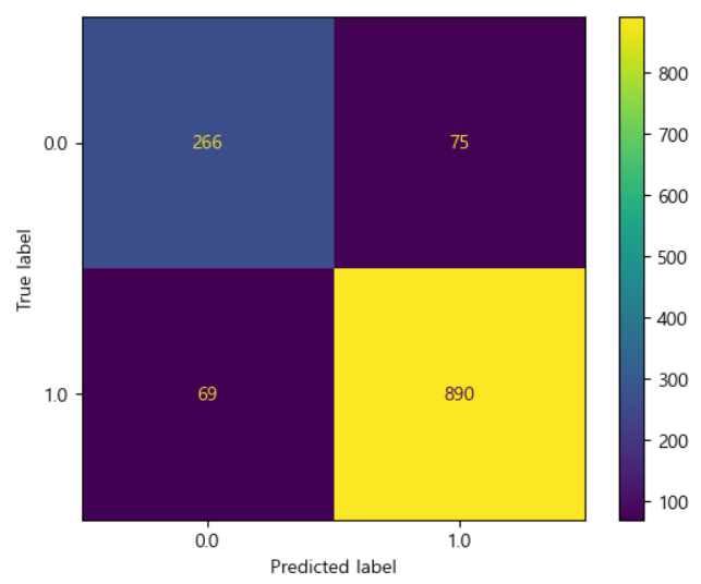 - 정확도(score)의 값과 오차행렬도의 시각화 결과로 최종 모델을 선정한다.